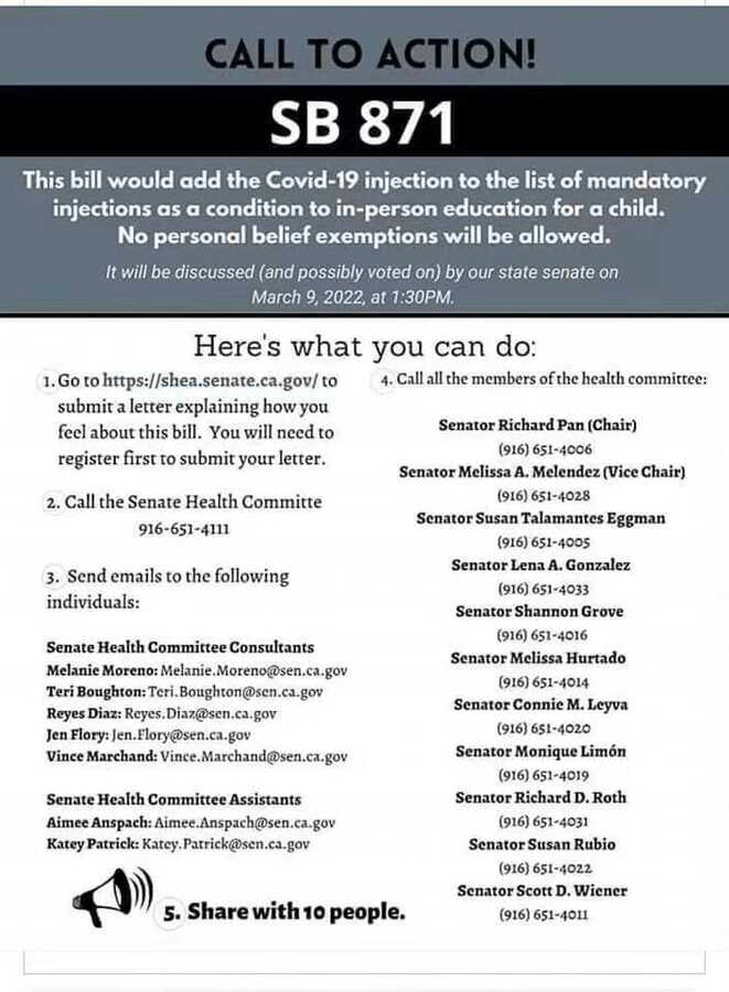 SB 871 မွေးကင်းစကနေ ၁၇နှစ်အထိ ကလေးအားလုံးကို ကလေးထိန်းကျောင်း (သို့) ကျောင်းတက်ဖို့ လိုအပ်ချက်တခုအဖြစ် အငြင်းပွားဖွယ်ရာဖြစ်နေတဲ့ ကာကွယ်ဆေးကို မထိုးမနေရလို့ သတ်မှတ်ဖို့။ (ဘာကြောင့်အငြင်းပွားစရာ ဖြစ်နေသလဲဆိုတာ အကျဥ်းရေးပြရရင် မ မျိုးပွားမှုပြဿနာ၊ ကိုယ်ဝန်ပျက်ကျ၊ နှလုံးရပ်၊ ကျားလူငယ်နှလုံးယောင်၊ သွေးမတိတ်၊ ရေယုံ၊ အာရုံကြောပုံမှန်မဟုတ်၊ အစရှိတာတွေအပြင် ထုတ်လုပ်စဥ်ကလည်း ဖုတ်ပူမီးတိုက် ထုတ်လုပ်ခဲ့လို့ ပုံမှန်ပြုလုပ်ရတဲ့ ဘေးကင်းစေမယ့် အဆင့်တွေကို ကျော်သွားခဲ့ပါတယ်။ ကာကွယ်ဆေးတွေရဲ့ ဘေးထွက်ဆိုးကျိုးတွေကို မှတ်တမ်းတင်တဲ့အဖွဲ့က မနှစ်က ဒီဇင်ဘာလဆန်းအထိ ဘေးထွက်ဆိုးကျိုးပေါင်း ၉သိန်း၂သောင်း ၇ထောင်ကျော်ရှိပြီး အဲဒီထဲက နှစ်သောင်းနီးပါးက အသက်ပါဆုံးရှုံးသွားတာဖြစ်ပါတယ်။ ဆေးထိုးတဲ့လူတသိန်းမှာ တဦးနှုန်းလောက် ပစ်ရတယ်လို့ ပြောရမှာပါ။ ပုံမှန်ဆို လူ၁၀ဂဏန်းမပြည့်ခင် ရီကောခေါ်ရပါတယ်။ အခုတော့ မခေါ်တဲ့အပြင် မန်ဒိတ်ပါ ထပ်ချနေသေးတာပါ။ ဆေးဖော်တဲ့ထဲမှာပါတဲ့ ဆရာဝန်ကြီးက ပလိုးစီကို ဘေးဖြစ်နိုင်ခြေ ရှိတဲ့အတွက် သတိနဲ့သုံးကြဖို့ သတိပေးခဲ့တာအားလုံးကို ပယ်ရှားပစ်ပြီး ဘေးဖြစ်နိုင်ခြေ ရှိမှန်းသိသိနဲ့ မန်ဒိတ်အတင်းလုပ်နေကြတာ ဖြစ်ပါတယ်။ အရင်ကာကွယ်ဆေးတွေက အချိန်အကြာကြီးယူဖော်စပ်ခဲ့ပြီး သုံးခဲ့တဲ့နှစ်ပေါင်းရှည်ကြာရှိခဲ့ပြီဖြစ်လို့ အရင်ဆေးတွေနဲ့ တန်းမညှိကြဖို့တော့ လိုပါတယ်။)