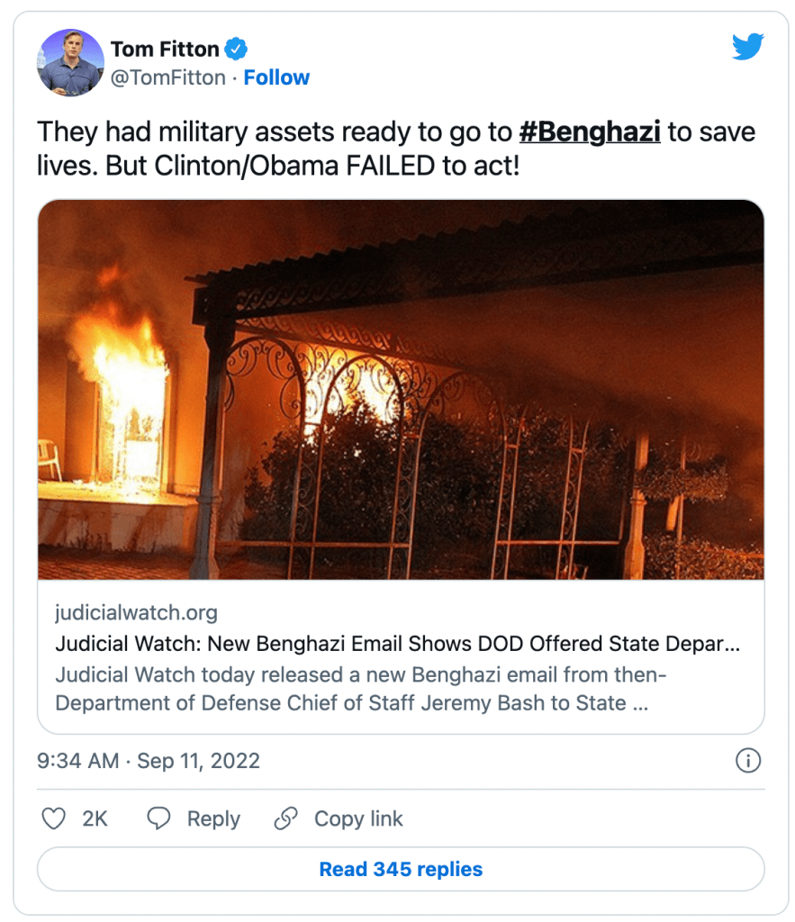 9/11 မှာ နှစ်ပတ်လည် နှစ်ခုရှိပါတယ်။ ၂၀၀၁ တုန်းက WTC မှာဖြစ်သွားတဲ့ ကိစ္စကို လူအများသိကြပေမယ့် ၂၀၁၂တုန်းက လစ်ဗျားနိုင်ငံ ဘန်ဂါဇီမြို့မှာ ဖြစ်ပွားခဲ့တဲ့ အမေရိကန်သံရုံး တိုက်ခိုက်ခံရမှုကတော့ မူလ ၉/၁၁လောက် လူသိမများပါဘူး။ အဲဒီဘန်ဂါဇီအကြမ်းဖက်မှုမှာ လစ်ဗျားနိုင်ငံဆိုင်ရာ အမေရိကန်သံအမတ်ကြီး၊ သံရုံးဝန်ထမ်းတဦး၊ စီအိုင်အေကန်ထရိုက်တာနဲ့ နေဗီဆီးလ်ဟောင်း နှစ်ဦး ပေါင်း ၄ဦး အသတ်ခံခဲ့ရပါတယ်။