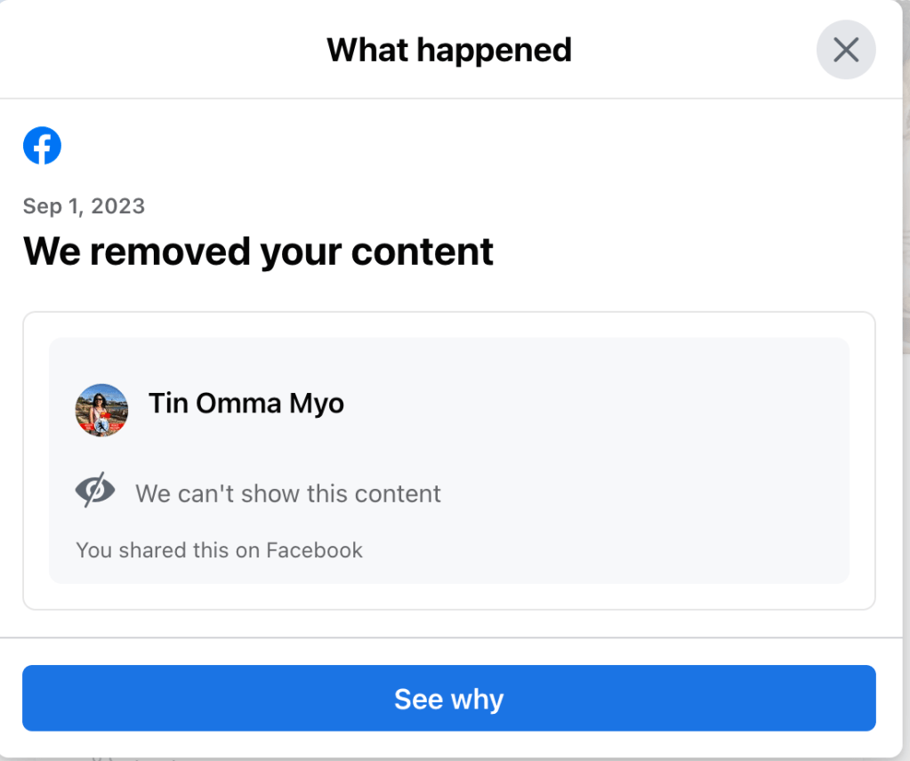 “သင်၏ပို့စ်သည် ကွန်မြူနတီစတန်းဒတ်နှင့် ငြိနေလို့ အပြစ်ရှိတဲ့အတွက် သင့်အကောင့် ကန့်သတ်ခံရပါမည်။ ကျူးလွန်ထားသော သင့်ပို့စ်ကိုတော့ ဖော်ပြခြင်း မပြုနိုင်ပါ။” ဆိုတော့ ပို့စ်မတင်တာလည်း ကြာပြီ၊ ရှယ်တာတောင် မရှိသလောက်ဖြစ်နေမှ ဘယ်ပို့စ်ကို ဘာတွေလာစူးရောက်နေတာလဲ ဖွဘုတ်ရေ။ ရကပကလည်း တနှစ်ကျော်လိုပါသေးတယ်၊ ခုထဲက စညစ်နေပြီလား။ ကျန်းမာရေးကြောင့်နဲ့ မိသားစုကြောင့် ရေးဖို့လုံလောက်တဲ့အချိန် မပေးနိုင်လို့ မတင်ဖြစ်တာ ခုတော့ သူတို့တပ်လှန့်လိုက်မှ ပြန်တင်ရတော့မလို ဖြစ်နေပြီ။ ဒီမှာမတင်ရရင် ဘလော့မှာသာ လာကြည့်ကြတော့။