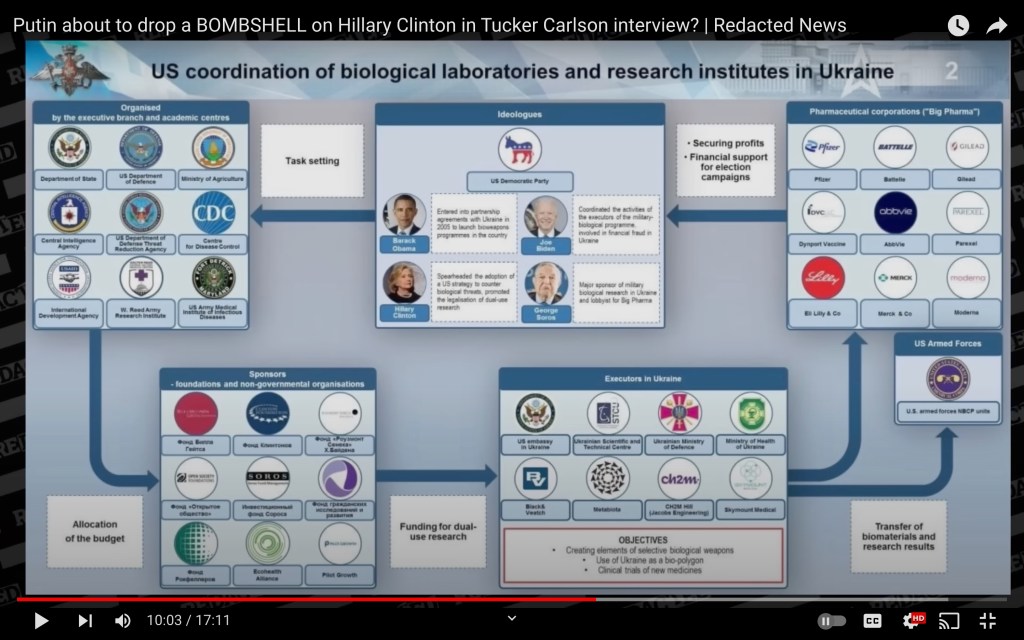 ဂလိုဘယ်လစ်အီလိတွေကလည်း ကမ္ဘာချင့်အောင် နေချင်တဲ့ ရေ့စစ်အကြီးစားတွေဖြစ်ပြီး တခြားလူတွေကိုတော့ ကမ္ဘာမှာလူဦးရေသိပ်များနေလို့ နည်းမျိုးစုံနဲ့ လျော့ဖို့ ကြံနေတာ သိကြမှာပါ။ ဟစ်တလာလိုပဲ သူကြည့်မရတဲ့ သူထိန်းချုပ်လို့မရတဲ့ ဂျူးတွေကို ရှင်းပစ်ပြီး ဆံဝါ မျက်လုံးပြာ လေးတွေပဲ ပွားလာအောင် လုပ်ချင်တာနဲ့ သွားတူနေပါတယ်။ အမေရိကန်စစ်တပ်က စိတ်ဓါတ်စစ်ဆင်ရေးအရာရှိဟောင်း စကော့ဘန်းနက်ကိုယ်တိုင် ဆက်စပ်မှုစာရွက်စာတမ်းတွေ တွေ့ရှိထားသူဖြစ်ပြိး ကေဂျီဘီဟောင်းပူတင်ကလည်း ပိုးပေါင်းစုံစမ်းနေတဲ့ ဘိုင်အိုလက်ဘ်တွေရော၊ လူ့ကျင့်ဝတ်နဲ့မညီတဲ့ စမ်းသပ်မှုတွေကို သူ့အိမ်နားမှာ လာလုပ်နေတာကို ရိပ်မိမယ်လို့ ယုံကြည်ကြောင်း၊ ယူကရိန်းနဲ့ မော်စကိုတို့ စိန့်ပီတာစဘတ်တို့ကလူတွေက ဒီအန်အေအားဖြင့် အလွန်နီးစပ်တော့ ယူကရိန်းမှာ ပိုးတွေလာစမ်းနေတာကို ပူတင်က စိတ်အေးနေနိုင်မှာ မဟုတ်ကြောင်း ပြောသွားတာကို ရီဒက်တက်က ကိုးကားသွားပါတယ်။