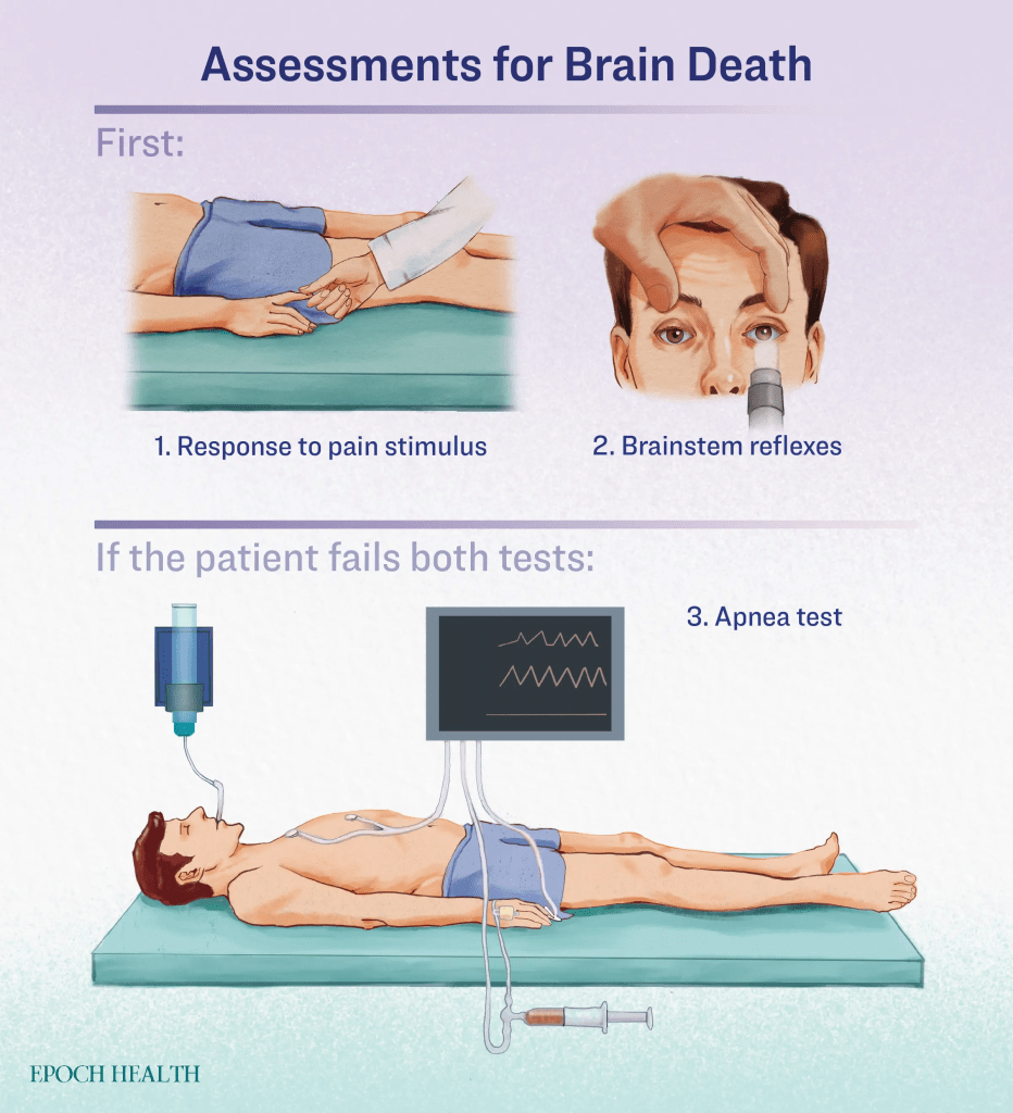 အရင်ကတော့ ဦးနှောက်သေသွားပြီဆိုရင် သူ့ဖာသာသူ အသက်မရှုနိုင်တဲ့အတွက် စက်နဲ့ရှုပေးရင် နှလုံးကစလို့ ကျန်အင်္ဂါတွေ ကောင်းကောင်းအလုပ်လုပ်နိုင်ပြီး တော်ရုံပိုးမွှားတွေကိုပါ တိုက်ထုတ်နိုင်တဲ့အထိ စွမ်းကြသေးပေမယ့် ဘရိန်းဒက်လို့ ဆရာဝန်က ကြေငြာလိုက်တာနဲ့ အော်ဂန်ဒိုနာဆိုရင် ကလီစာတွေ ပေးလှူဖို့ ပြင်ဆင်ကြပါတယ်။ အော်ဂန်ဒိုနာအဖြစ် မိမိကိုယ်တိုင်က ရွေးချယ်ထားခဲ့ရင် မိသားစုက ငြင်းပိုင်ခွင့်မရှိပါဘူး။ စက်နဲ့အသက်ဆက်စေမလား/ မဆက်ဘူးလား ဆိုတာကိုတော့ သူအသက်ရှိစဥ်က စီမံခဲ့တာမရှိရင် မိသားစုက ဆုံးဖြတ်ရမှာဖြစ်ပါတယ်။ ကလီစာတွေ ထုတ်ယူရာမှာလည်း များသောအားဖြင့် ဘရိန်းဒက်တွေဟာ ခံစားမှု မရှိဘူးဆိုပြီး မေ့ဆေး/ထုံဆေးစသည် မပေးကြတာများပါတယ်။ တချို့ဆရာဝန်တွေကပဲ ခံစားချက်ရှိခဲ့သည်ရှိသော် ဆိုတဲ့အတွေးနဲ့ လိုရမယ်ရ ထုံဆေးပေးပြီး ခွဲကြပါတယ်။
